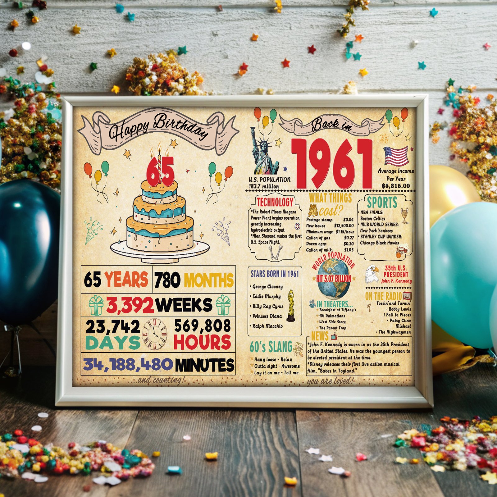 • Product Introduction– Find interesting one a double sided 65 birthday card for your family or friends. The cards contain some specific events which can help you review interesting facts with with you loved.