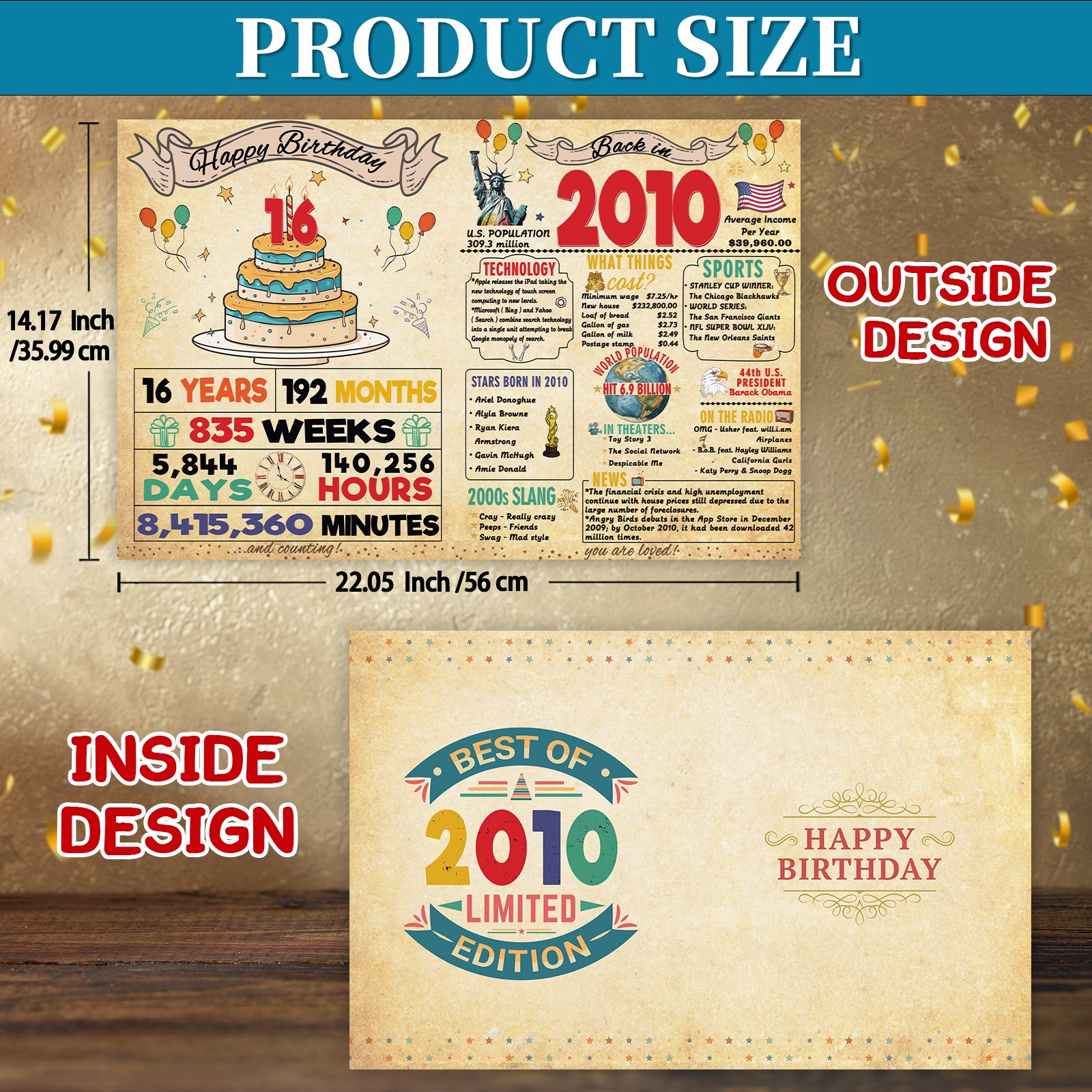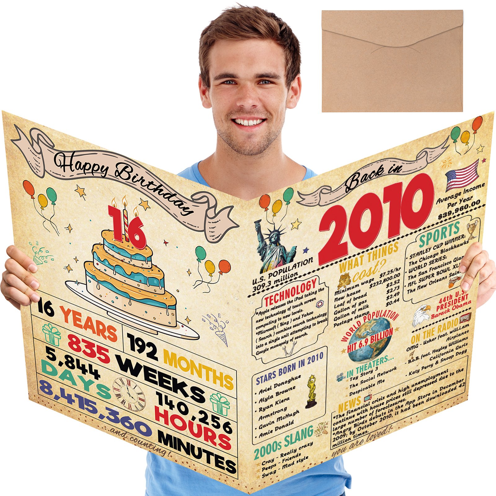 - Product Introduction– Find interesting one a double sided 16 birthday card for your family or friends. The cards contain some specific events which can help you review interesting facts with with you loved.